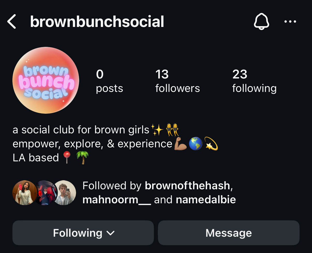 making new friends in your twenties can be an uphill battle, and brownbunchsocial intends to connect South Asian women in the Los Angeles area with each other across a variety of interests, hobbies, cultures, spirituality, and –. the initative has been focused on building community engagement and awareness through digital marketing, influencer partnerships, and social content strategy.