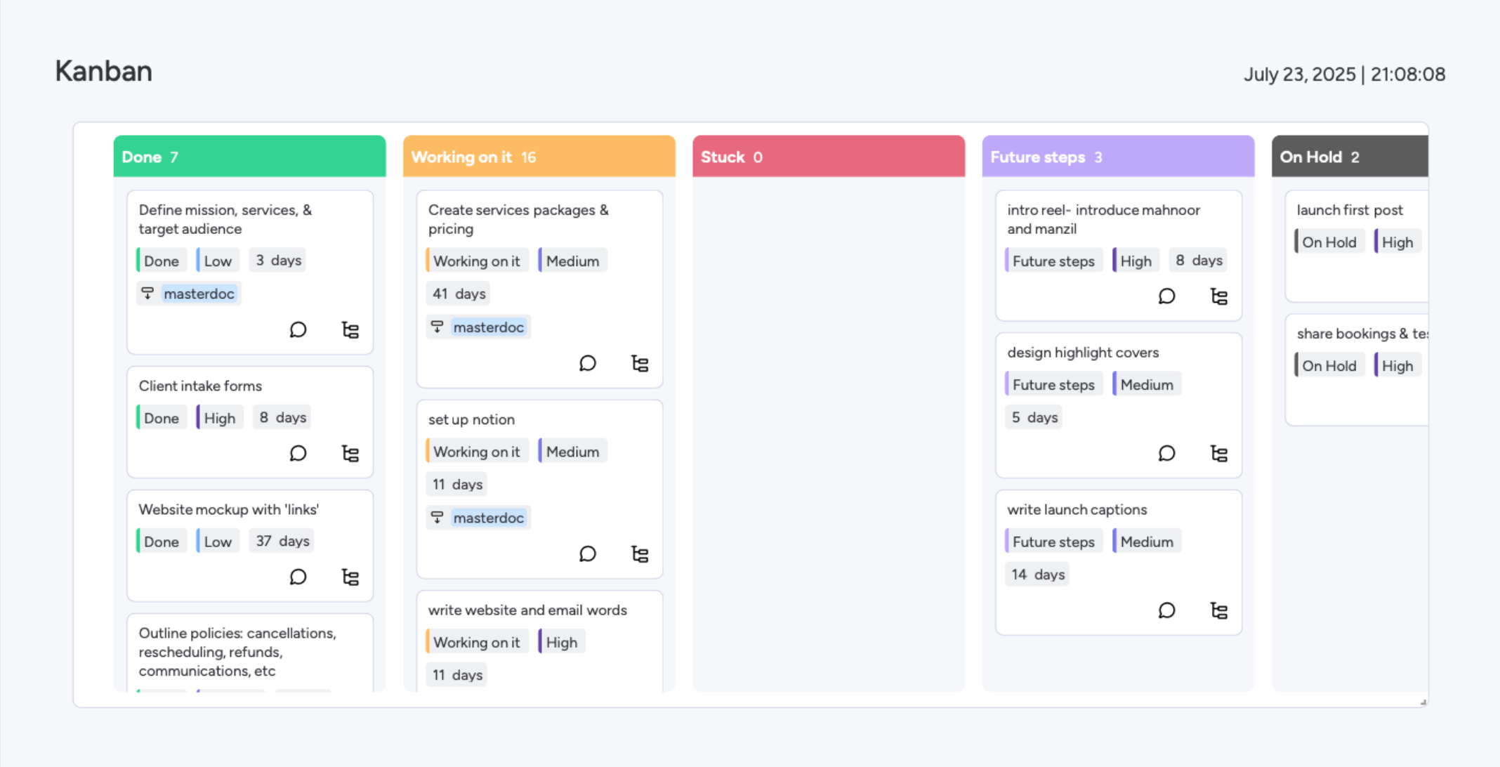 used Monday.com boards to monitor daily progress and update priorities dynamically
