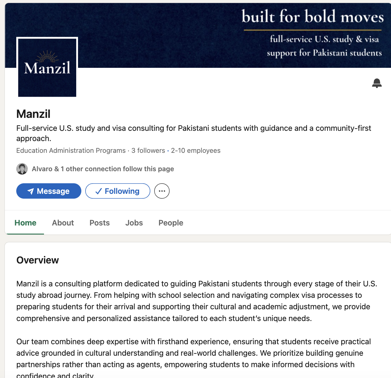 Manzil is a start-up consulting firm targeting Pakistani students interested in coming to the US pursuing higher education on student visas, standing out with its client-first approach. the Manzil journey supports client from school and visa application through settling in their new city.